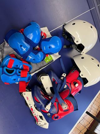 Conjunto completo para patinaje con casco, protecciones y patines. - Casco blanco + otro de regalo (ver medida en fotos ) - Juego de protecciones (rodilleras, coderas, muñequeras) en azul y rojo 6-10 años - Patines en línea Oxelo, talla 36-39, en azul y rojo.