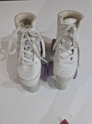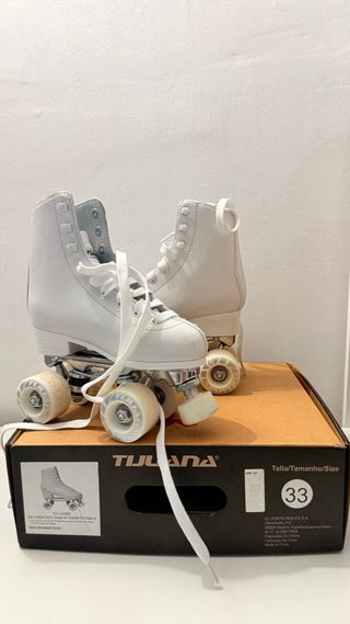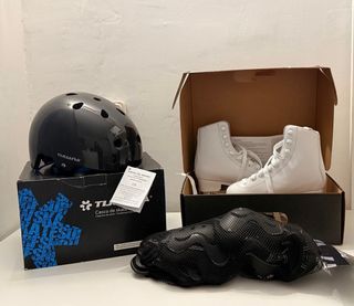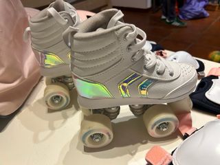Set completo para patinar con seguridad. Incluye patines, casco y protecciones. - Patines blancos de 4 ruedas. Talla 33-35 - Casco negro marca Tijuana. - Juego de protecciones para rodillas y codos.