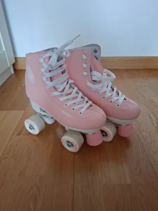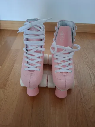 Patines de estilo clásico en color rosa, perfectos para iniciarse. Se puede vender el set completo con casco a juego y protrcciones. - Diseño alto tipo bota. - Cordones blancos. - Ruedas blancas. - De Fecathon, número 34/35. - Usados dos tardes, media hora o así. Se aptecia que estan nuevos, solo por dentro de la bota, arriba del calcetín quedo un poco negro, de aprecia en foto.