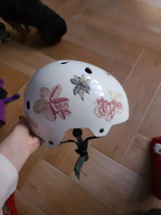 Casco blanco con un diseño de flores en tonos rojos y negros. Ideal para patinar con estilo y seguridad. - Con rueda para ajustar al tamaño de la cabeza. - Diseño con flores. - Color blanco.