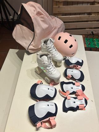 Conjunto completo para patinar, ideal para iniciarse. Incluye patines, casco y protecciones y bolsa. utilizado una vez. nuevo vale 100€. - Patines blancos talla 31. - Casco rosa. - Juego de protecciones (rodilleras, coderas y muñequeras). - Bolsa de transporte rosa.