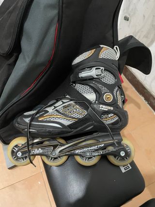 Mochila en color negro con detalles en gris y rojo. Cuenta con un bolsillo frontal y uno trasero, con cremallera y un compartimento principal. Patines de raya de marca fila con unos rasgos de uso + un casco que promete proteccion. - Compartimento principal espacioso. - Bolsillo frontal con cremallera. - Correa ajustable para el hombro. - patines talla 41 - marca fila