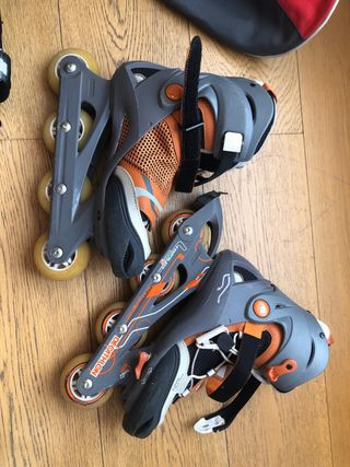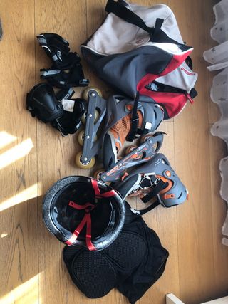 Kit completo para patinar, ideal para niños. Incluye patines, casco y protecciones. - Patines en línea negros con detalles naranjas. Usados un día. - Casco azul con diseño infantil marca Abus, talla regulable 45-50cm en muy buen estado. - Casco rojo de regalo, marca Btwin talla regulable 47-53cm. Tiene más uso pero aún sirve. - Juego de protecciones (rodilleras, coderas, muñequeras). Las rodilleras tienen bastante uso, pero el resto está en buen estado. Con bolsa. - Bolsa de transporte azul de regalo.
