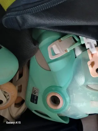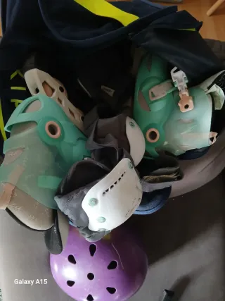 Lote, patines y accesorios niños. Decathlon. - Incluye bolsa de transporte, patines, casco, rodilleras, coderas y muñequeras. - Tiene marcas y rasguños pero sólo ha sido usado unas cuantas veces para el colegio.