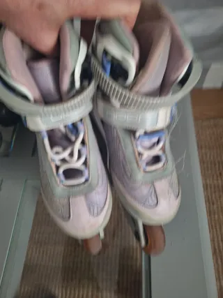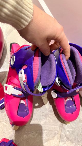 Set de patines rosas y casco de protección para niños. - Patines ajustables en talla. - Casco con diseño ventilado. Talla 33. Por dentro están bien y por fuera con roces del uso. Es casco está como nuevo