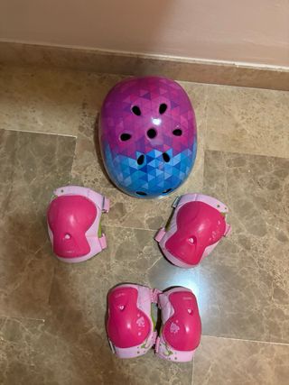 Set de protecciones infantiles para patinar o montar en bicicleta. Incluye casco y protectores. - Casco de color morad. - Protectores para rodillas y codos. - Tienen marcas de uso pero se pueden seguir usando.