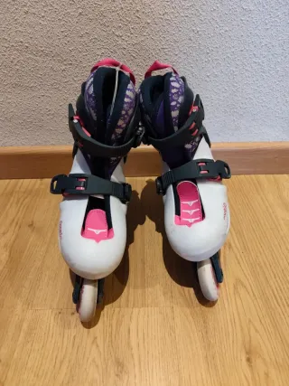 Patines en línea ajustables para tallas de la 35 a la 38. Perfectos para iniciarse en el patinaje. - Diseño en color lila y gris. - Cierre de velcro y cordones. - incluye bolsa de transporte y casco