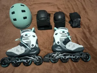 Conjunto completo para patinar con seguridad. - Patines en línea de color gris y blanco. - Casco de protección en color verde menta. - Rodilleras. - Coderas. - Muñequeras.