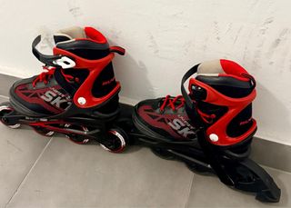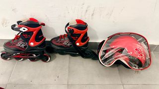 Se venden patines en línea en color rojo y negro. Son cómodos y seguros para patinar. Incluye bolsa con casco y todas las protecciones. - Diseño deportivo. - Cierre de velcro y cordones. - Ruedas resistentes.
