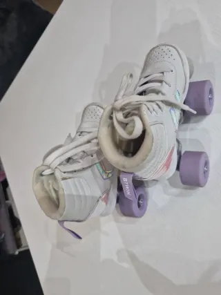 Estos patines de cuatro ruedas son de color blanco con detalles iridiscentes. Talla 28 - Cierre con cordones. - Ruedas de color lila. - Tira de agarre en el talón con el logo 'BTWIN'.Casco blanco de regalo