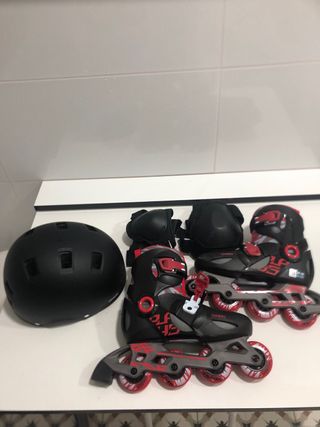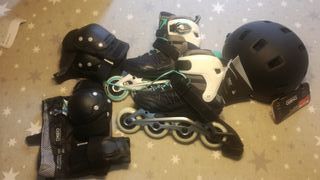 Patines en línea ajustables para tallas de la 38 a la 41. - Patines ajustables (59,99 € nuevos) - Mochila para patines (24,99 € nueva) - Casco (19,99 € nuevo) - Protecciones (19,99 € nuevos) * El pack completo nuevo en Decathlon cuesta 124,96 € y puede ser tuyo por la mitad del precio :)