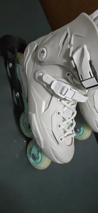 Patines en línea en color blanco con detalles en menta. Cuentan con cordones y cierres de velcro. También los vendo con las protecciones y casco. Llevan el freno nuevo. Todas las protecciones son negras y talla M. - Diseño moderno. - Ruedas de patinaje.