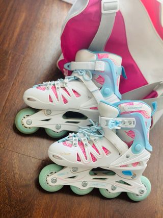 Conjunto completo de patines en línea extensibles para niña, ideal para iniciarse en el patinaje. Incluye casco y protecciones. - Patines extensibles en tallas 32-35. - Diseño en color rosa y negro. - Casco protector rosa con ventilación. - Juego de rodilleras y coderas. - Bolsa de transporte rosa. La caja de los patines está un poquito rota por arriba. No se ha usado.