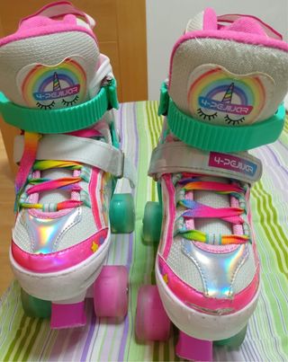 Patines ajustables para niñas, ideales para aprender a patinar. El diseño es divertido y colorido con temática de unicornio. - Tallas ajustables de 34 a 37. - Cierre de velcro y cordones. - Ruedas de colores. - Casco incluido