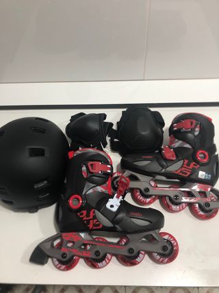 Conjunto de patines en línea ajustables Oxelo, ideal para iniciarse en el patinaje. Incluye casco y protecciones. - Patines en línea ajustables. - Casco de protección. - Juego de rodilleras y coderas. - Bolsa de transporte negra con logo Oxelo.