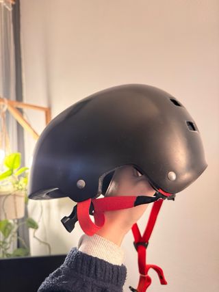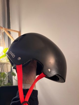 Casco de protección en color negro, ideal para patinar o montar en bicicleta. - Diseño mate. - Cierre ajustable. - Marca: Oxelo. Barely used scooter helmet from Decathlon. Original price was €20.