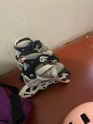 Se venden patines en línea Oxelo, con bolsa de transporte y casco rosa, en buen estado. También doy protecciones para manos,codos y rodillas. - Color gris y blanco. - Cierre con cordones, velcro y hebilla. - Ruedas de 76 mm. - Talla ajustable 32-35.