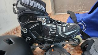 Patines en línea marca Fila, con bolsa de transporte, protecciones de rodillas, codos, manos y casco a juego. Talla 44. Muy poco uso