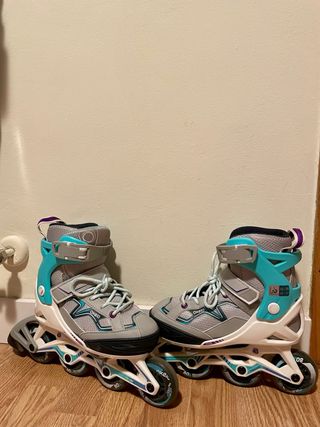 Patines en línea Rollerblade, grises y rosas, en buen estado. Ideales para principiantes. - Modelo: Rollerblade (se ve en la imagen) - Color: Gris y rosa - Talla: 39 - Incluye un par de patines, casco, protectores , mochila y conos