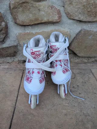 Patines en línea Roces para niña, con un diseño floral precioso. Están en muy buen estado y son ideales para principiantes. - Incluye dos patines, casco morado, protecciones talla S y bolsa de transporte. - El casco, las protecciones y la bolsa están en buen estado. - Los patines son ajustables. Talla 34 a 37 de patines Protecciones talla S Casco 50-54 Solo patines 40€ Todo el conjunto 45€