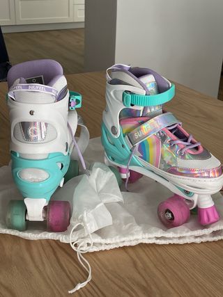 Patines Oxelo en buen estado, ajustables del 35 al 38. Incluye casco y protecciones (rodilleras y coderas). - Casco de color rosa. - Juego de protecciones (rodilleras y coderas) rosa. - Bolso de viaje en perfecto estado (lo lavaría justo para entregar/enviar). Todo en muy buen estado. Las rodilleras algo rayadas del uso.