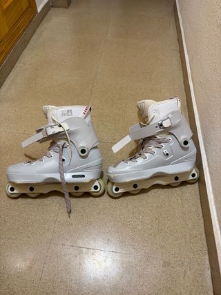 Patines agresivos USD Aeon 60, edición especial 25 aniversario en muy buen estado y poco uso. - Talla 44/45 - Color gris claro. - Cierre de velcro y cordones. - Ruedas de 60mm. Se da el casco y los protectores nuevos sin estrenar.