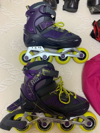 Patines en línea de la marca Oxelo, ideales para iniciarse. El color es morado con detalles en rosa y amarillo. Tb un casco. - Talla ajustable de 34 a 36. - Cierre con velcro y hebilla. - Ruedas de 70 mm.