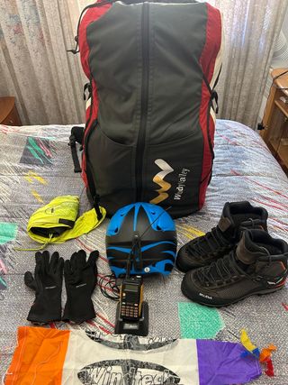 Equipo completo de parapente. Vuelo libre. Todo el equipo es del 2022-2023. Compuesto por vela homologación A, silla L/XL, colibag, portainstrumentos, vario, casco, radio, paracaídas... SOLO 3 HORAS Y MEDIA DE VUELO. Además se incluye equipo de campa con silla y vela AMG. Más información al 607783891. Posibilidad de vender por separado.