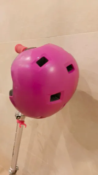 Patinete infantil de la marca Juguettos, ideal para los más pequeños. Incluye casco protector. - Color rosa. - Material: Metal y plástico. - Ruedas: 2. - Altura ajustable. Está como se ve en las fotos, se ha usado 2 veces.