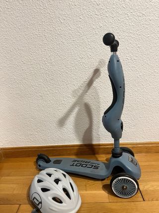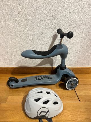 Conjunto de patinete y casco para niños. - Patinete convertible de la marca Scoot and Ride. - Casco protector blanco.