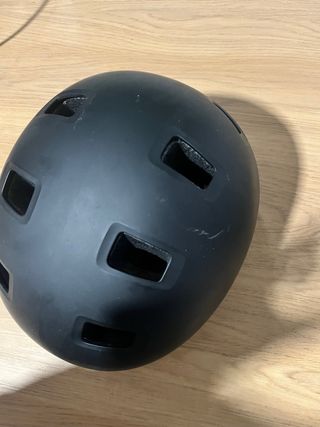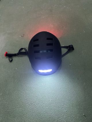 Casco negro para patinete con luces integradas. - 2 semanas de uso solamente. - Entrada de cargador tipo C (no trae cable) - la batería del casco jamás se me a gastado, dura muchísimo. - Luz frontal blanca. - Luz trasera roja. - Diseño con ventilación. - ajustable - talla L