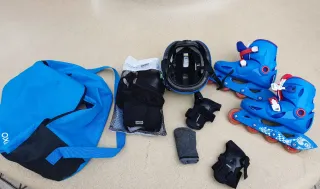 Conjunto completo de patines para niños, ideal para iniciarse en el patinaje de forma segura. Incluye todo lo necesario para protegerse. - Patines ajustables en color azul y rojo. - Juego de protecciones: rodilleras, coderas y muñequeras. - Casco protector en color rojo. - Incluye bolsa de transporte roja.