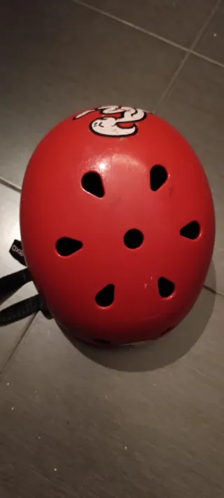 Casco de protección para patinete infantil, con un diseño llamativo y ajustable. - Color rojo brillante. - Diseño con personaje animado en la parte superior. - Sistema de ajuste para mayor comodidad. - Múltiples orificios de ventilación.