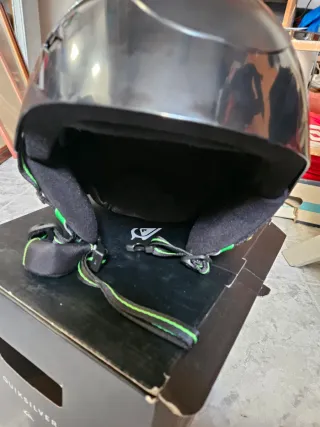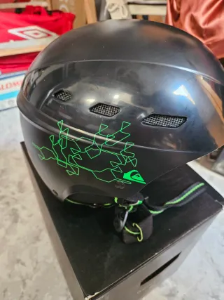 Casco de esquí o snowboard de la marca Quiksilver, en color negro con diseño geométrico verde. Se encuentra en perfecto estado, con un solo uso. - Talla: 58-62 cm. - Diseño: Negro con detalles verdes. - Marca: Quiksilver.