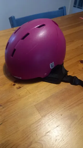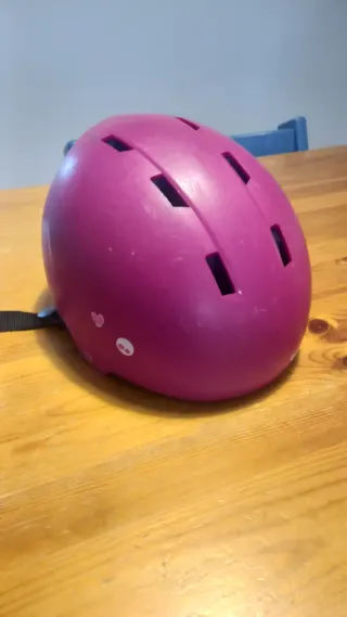 Casco de protección para niñas, ideal para patinaje, esquí o snowboard. Tiene algunas pegatinas puestas. Usado pero en Perfectas condiciones, con algunos signos de uso. Talla: 48 a 52 cm - Color: Morado. - Adornos: Corazones y caritas. - Cierre: Correa ajustable.