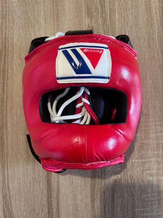 Casco de boxeo de la marca Winning en color rojo. Diseñado para proteger la cabeza durante el entrenamiento. - Cierre con cordones blancos. - Detalle de logo Winning en blanco, azul y rojo. -Talla única -Sin estrenar -Precio NO negociable