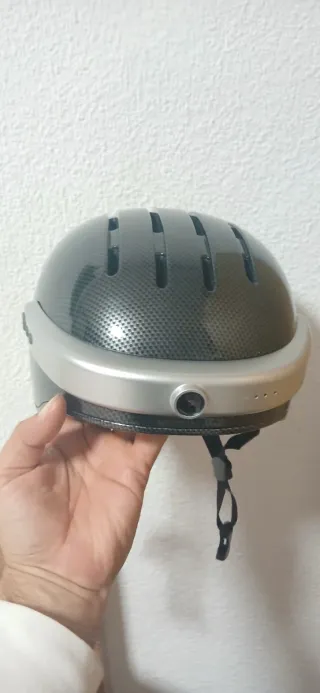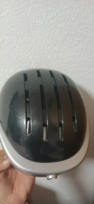 Casco de carbono con un diseño moderno y elegante. Perfecto para protegerte con estilo. - Material principal: Fibra de carbono. - Acabado plateado en la banda frontal. - Ranuras de ventilación. - Correa ajustable.