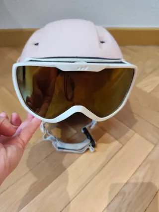 ¡Listo para las pistas! Vendo pack de casco de esquí/snowboard de la marca Wedze (Decathlon), modelo Piste 500, junto con gafas de ventisca de alta visibilidad. El casco tiene un acabado rosa mate precioso y muy actual. Características: Modelo: Piste 500, diseñado para una protección óptima y gran ventilación superior. Ajuste: Rueda posterior para un ajuste preciso y cómodo a la cabeza. Confort: Orejeras acolchadas y forro interior suave y limpio. Gafas: Montura blanca con lente de espejo dorada, perfectas para días de sol y nubes. Estado: Buen estado general, con marcas mínimas de uso que se aprecian en las fotos.