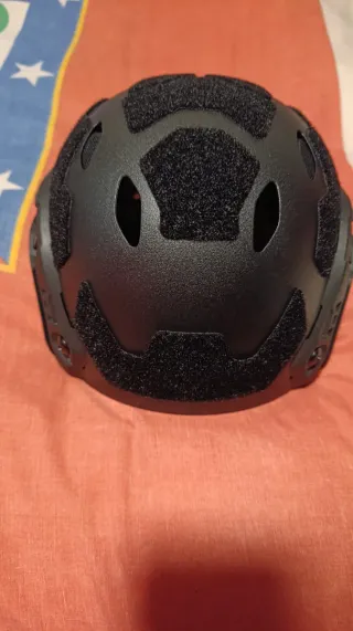 Casco táctico estilo OpsCore FAST en color negro. Diseñado para ofrecer protección y versatilidad en airsoft. Tiene cubiertas de velcro que rodean a las zonas con agujeros para dar ventilación a la cabeza, por dentro está cubierto con protectores de algodón para que sea más cómodo llevarlo. Tamaño: 27*22*16 cm (largo*ancho*alto incluyendo el arnés). Peso aproximado: 480 g.
