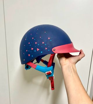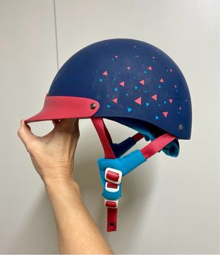Casco de montar para niños y niñas con un diseño divertido. No ha llevado ningún golpe. - Color azul marino. - Estampado de triángulos en rosa y azul claro. - Visera integrada en color rosa. - Correas ajustables con almohadilla azul. - Ruleta trasera para mayor ajuste.