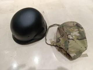 Casco de airsoft negro con funda diseño de camuflaje multicam. Incluye una correa reflectante. - Funda con patrón de camuflaje multicam. - Correa de elástica reflectante