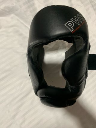 Casco de protección para boxeo, diseñado para cubrir la cabeza. - Material exterior de cuero sintético. - Color negro. - Acolchado interior.