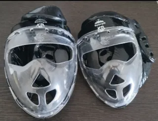 Cascos de protección para artes marciales con visera facial transparente (marca Daimyo). Ideales para entrenamiento de karate, Kudo o combate con protección. Protegen cabeza y rostro manteniendo buena visibilidad. En buen estado.