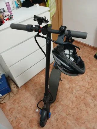 Patinete eléctrico en buen estado, ideal para desplazamientos urbanos. Incluye casco protector y cargador. - Patinete con plataforma antideslizante. - Manillar ajustable. - Casco negro con interior acolchado y cargador incluido.