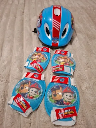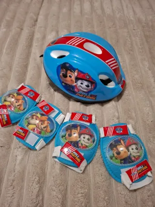Set de protección infantil con diseño de Paw Patrol. - Casco azul con detalles rojos y blancos. - Incluye rodilleras y coderas. - Personajes de Paw Patrol en las protecciones. - Cintas de ajuste.