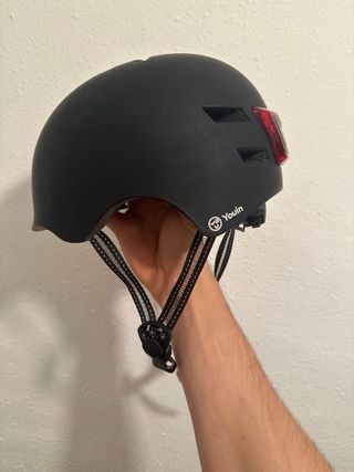 Casco de seguridad Youin en color negro, talla M. Cuenta con luces LED integradas en la parte trasera para mayor visibilidad. - Diseño moderno y elegante. - Sistema de ajuste trasero. - Correa de sujeción ajustable.