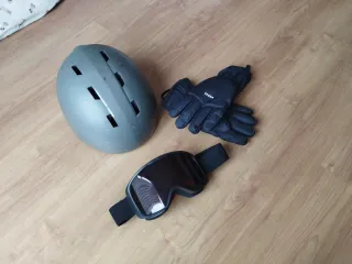Conjunto de complementos para esquiar. - Casco de color gris. - Guantes negros. - Máscara de esquí con lente oscura.