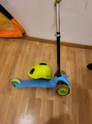Conjunto de patinete infantil y casco protector. - Patinete con manillar azul y ruedas azules. - Casco de protección de color rojo.