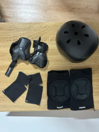 Set completo de protecciones para patinaje o skate. - Casco negro. - Muñequeras. - Coderas. - Rodilleras.