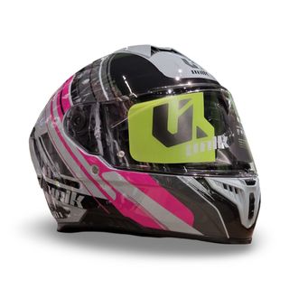Casco de moto Unik con un diseño moderno y llamativo. - Color base blanco. - Detalles en rosa y verde. - Visera transparente. -Calota en resina. -cierre micrometrico -preparado para pinlock -tallas xs s m -envios a peninsula incluido -pago bizum -whatsapp 717126282 -precio no negociable